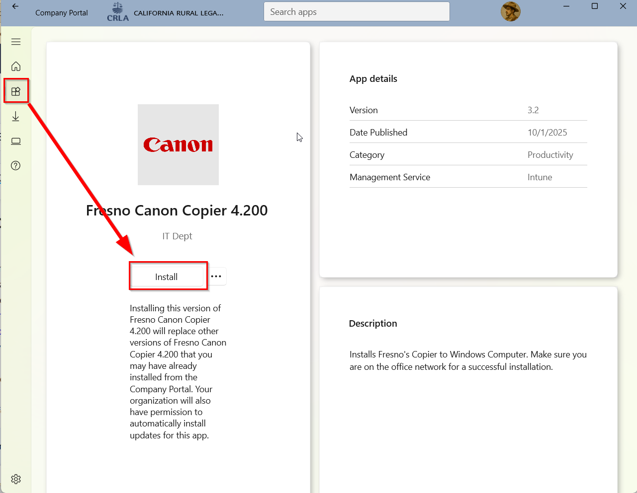 - While in Company Portal you can install your office copier, and any other app you need. Be sure to Install one App at a time.